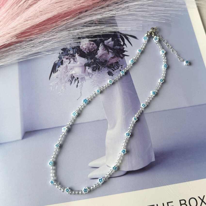 „Blue Daisy“ – tai rankų darbo vėrinys, kuriame dera lengvumas ir elegancija. Pagamintas iš aukštos kokybės čekiško stiklo kristaliukų ir ramunėlių formos stiklo karoliukų, su nerūdijančio plieno detalėmis. Ilgis reguliuojamas (36–43 cm), todėl puikiai prisitaiko prie bet kokio stiliaus ir kaklo linijos.