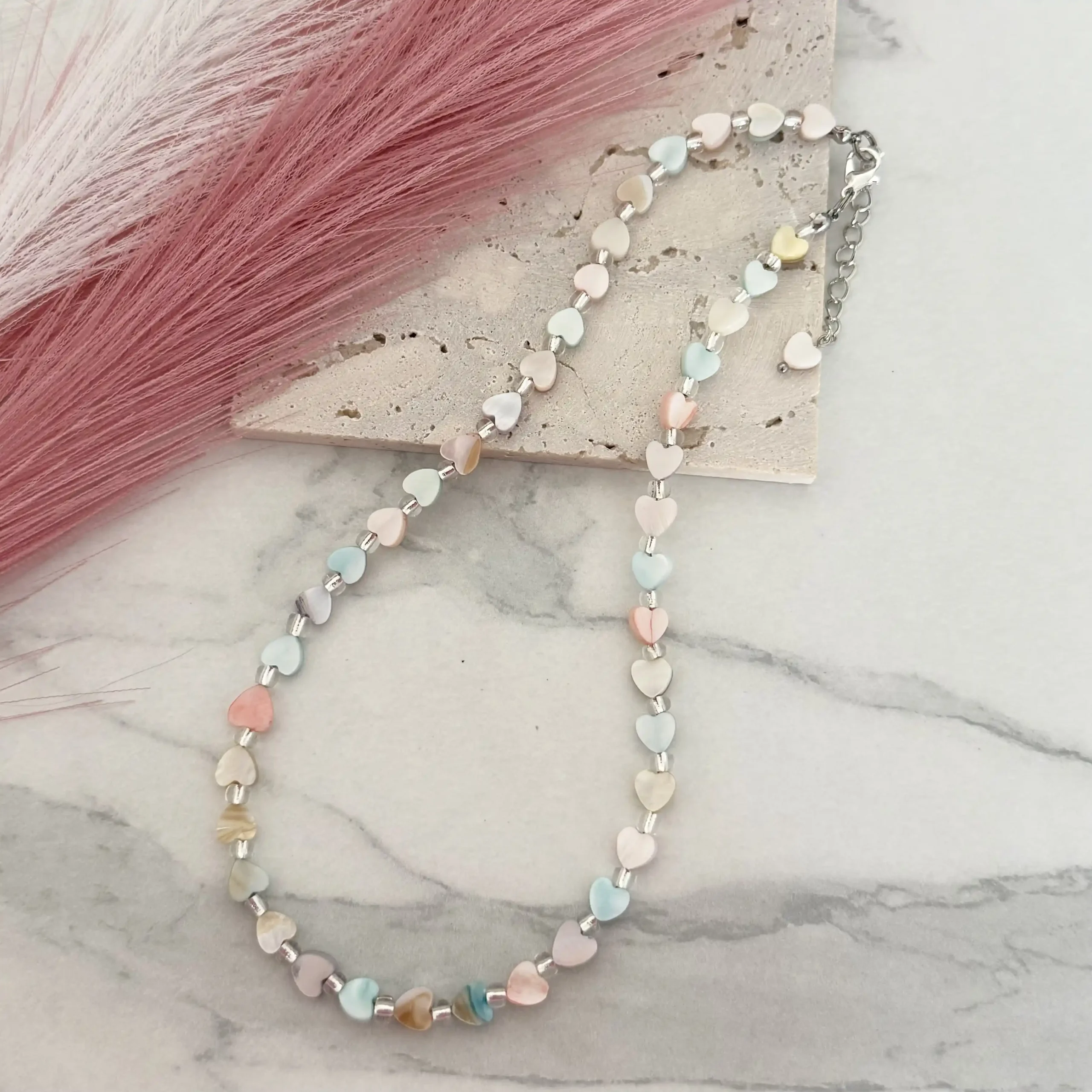 Handmade pastel necklace with heart-shaped shell beads. Light, playful, and perfect for spring and summer looks. Length: 40–45 cm.