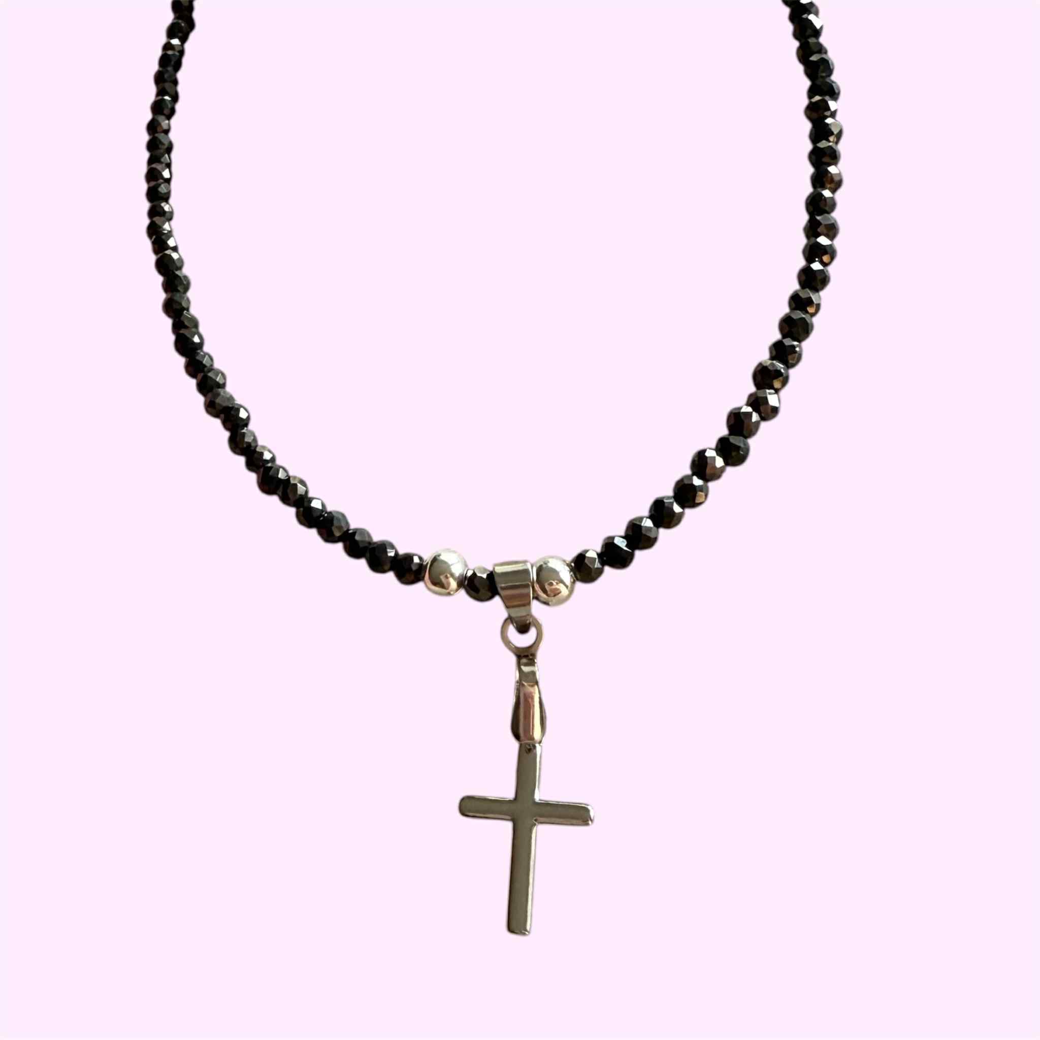 Handmade necklace with a cross pendant, featuring sparkling glass crystals and stainless steel details. Adjustable length – 39–45 cm.